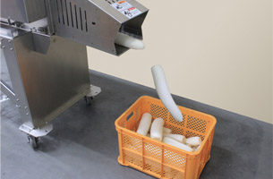 コンベアに大根を置くだけの簡単操作で、毎時1,800本(最大)の高速処理。 |