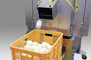 材料自動搬送タンクに玉ねぎをセットし、自動搬送されてくる玉ねぎをV台≠ノ置くだけの簡単作業で両端切り・皮むき作業を毎時3,000個の高速で処理します。